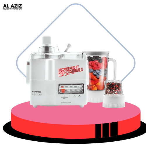 The Cambridge JB402 Juicer Blender 3-in-1 is a versatile kitchen appliance designed to simplify your food preparation tasks. Equipped with a robust 450W motor, it efficiently handles juicing, blending, and grinding functions. The appliance features durable unbreakable polycarbonate jars and stainless steel blades, ensuring longevity and consistent performance.
